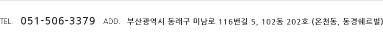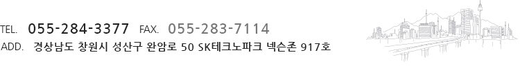 ADD : 경상남도 창원시 성산구 성산동 완암로 50 SK테크노파크 넥슨존 917호 / 부산광역시 동래구 미남로 116번길 5, 102동 202호(온천동, 동경쉐르빌)